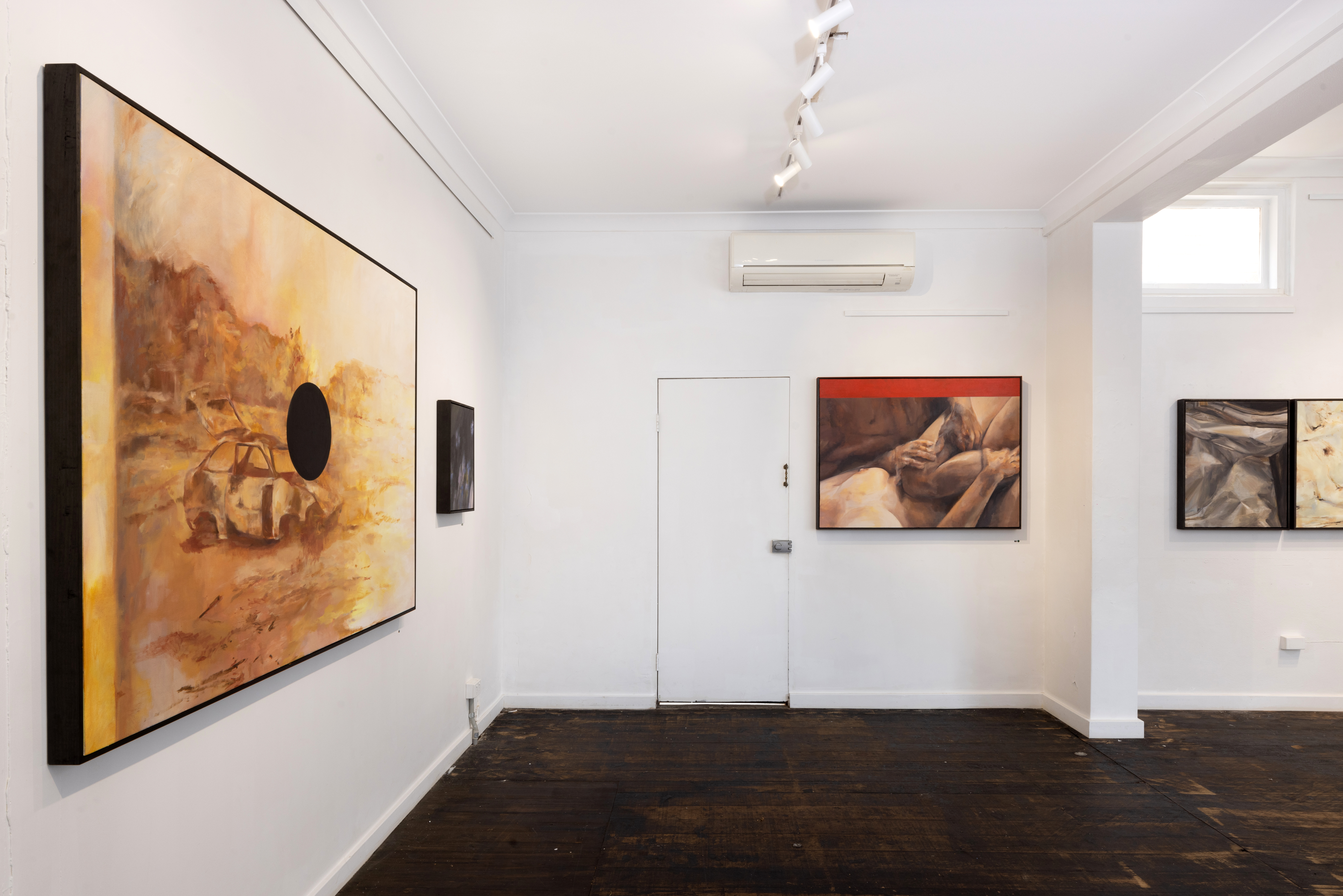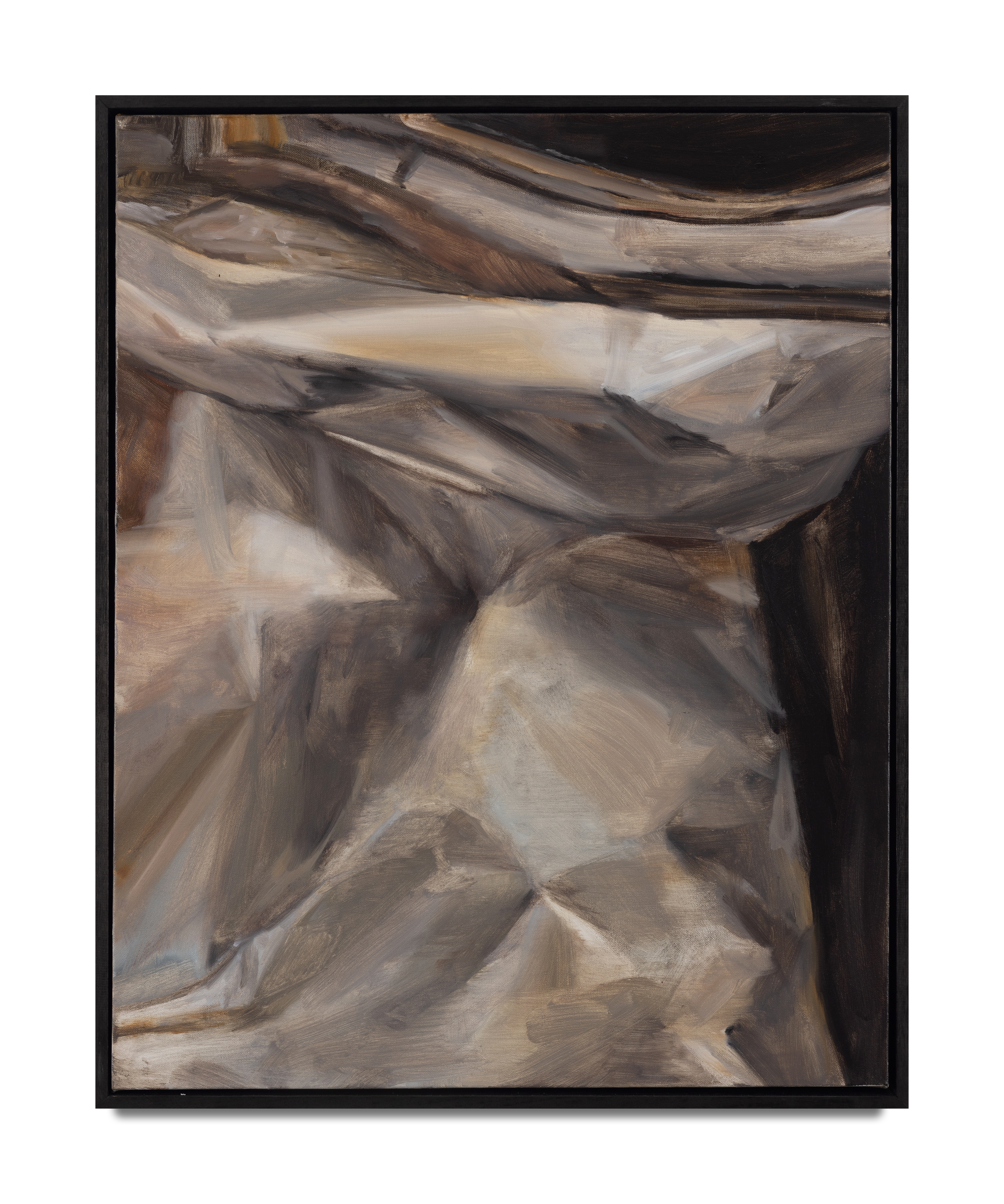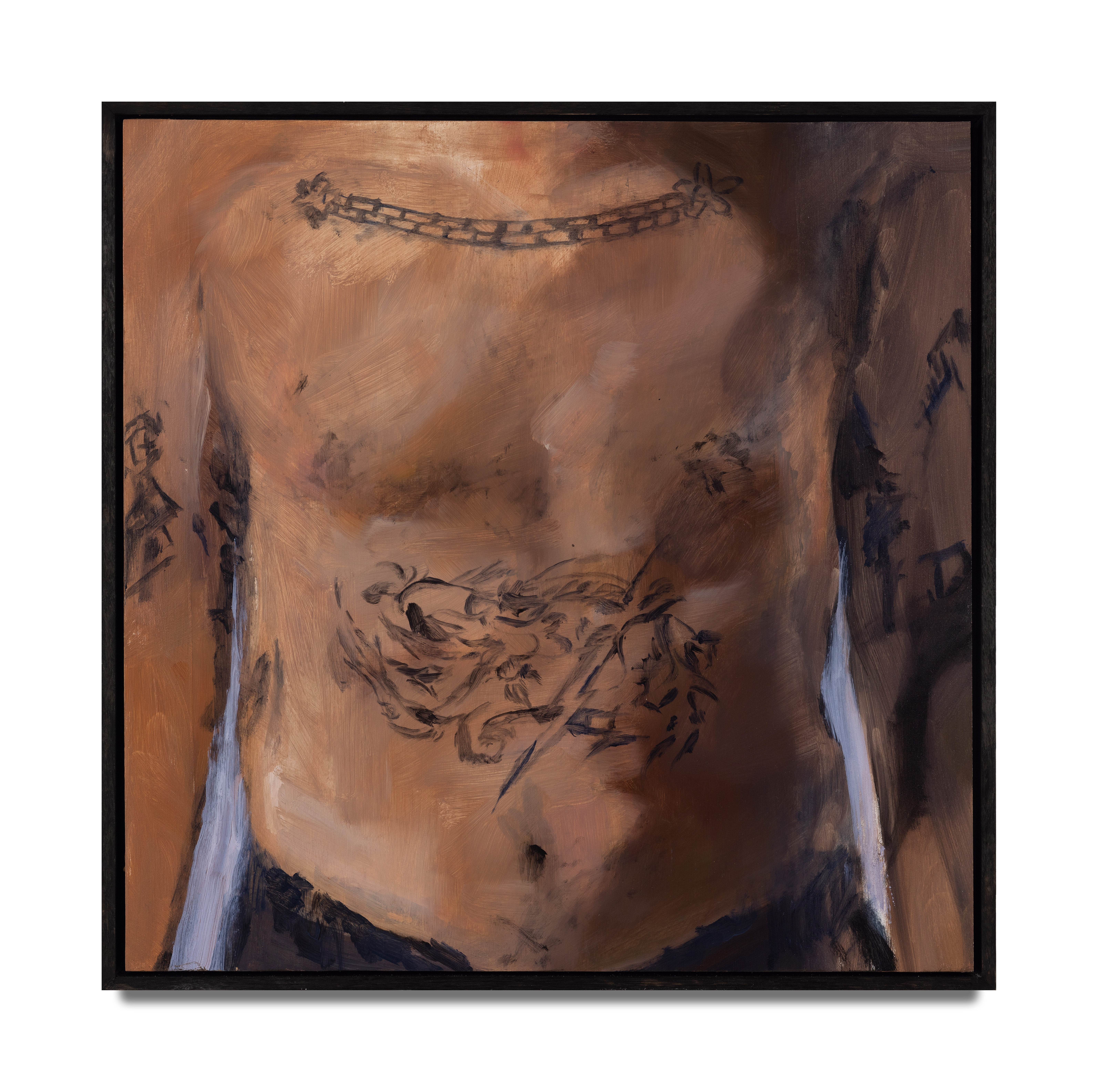 BODYACHE is an explorative and revealing collection of new works by Brontë Naylor. The artist presents a more immediate, quiet, and straightforward series of paintings that push through the ends, edges, and folds of grief, love, and mourning. Her commitment to ambiguity and emotional depth takes center-stage as the artist’s solemn perspectives resonate in the unanswered spaces and creases of bodily flesh and metal and landscape showcased in this exhibition.